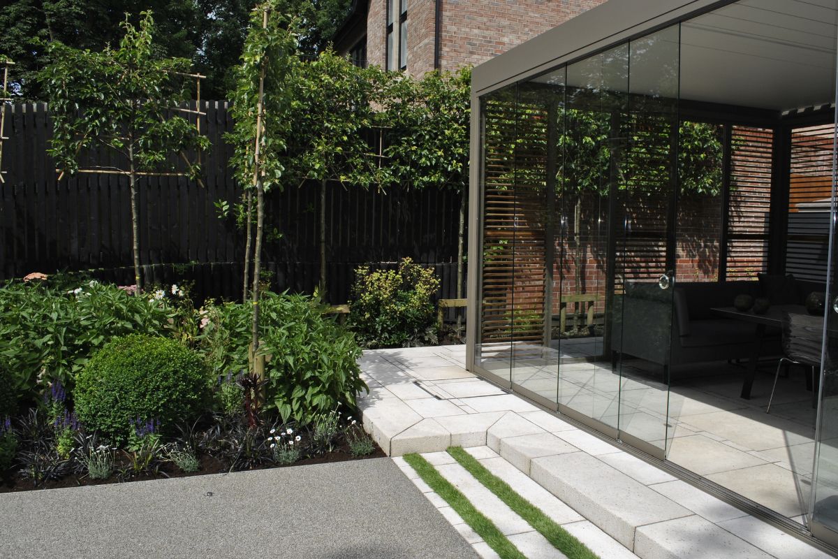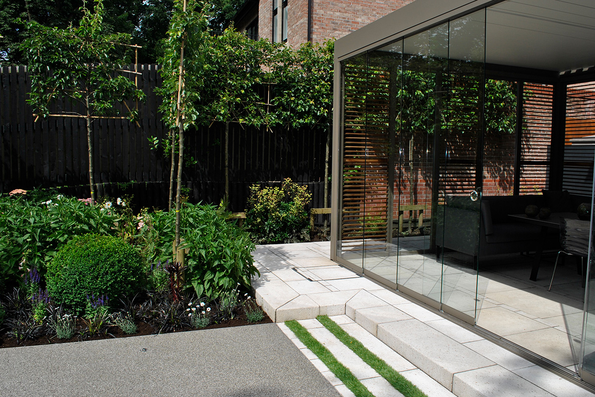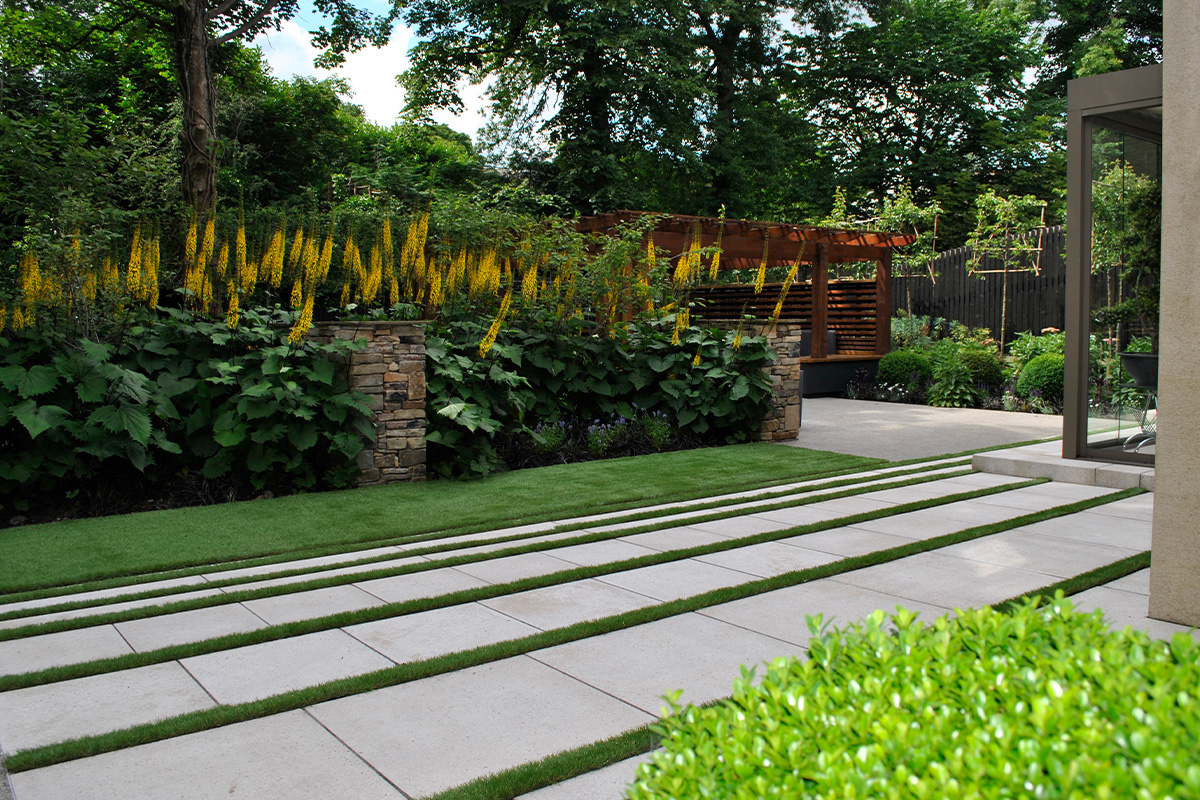 In all garden designs, it is important to develop a palette of materials that are suitable for the specific conditions of the site as well as the overall appearance theme desired. For this luxury garden design, we needed to rely on low-maintenance materials that would perform well in shaded areas and also offer an amount of reflected light to brighten up what can be quite a gloomy space on long winter days.