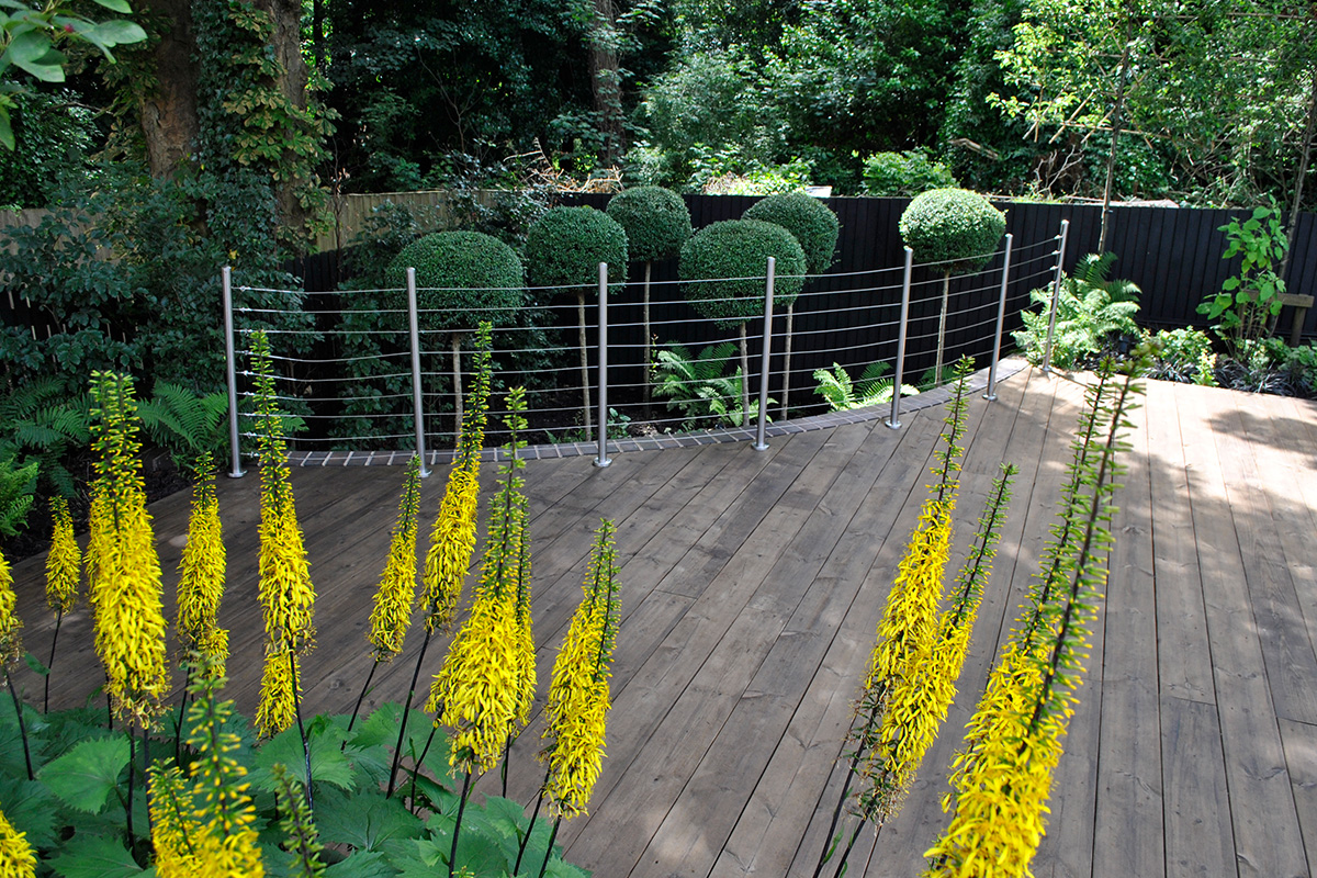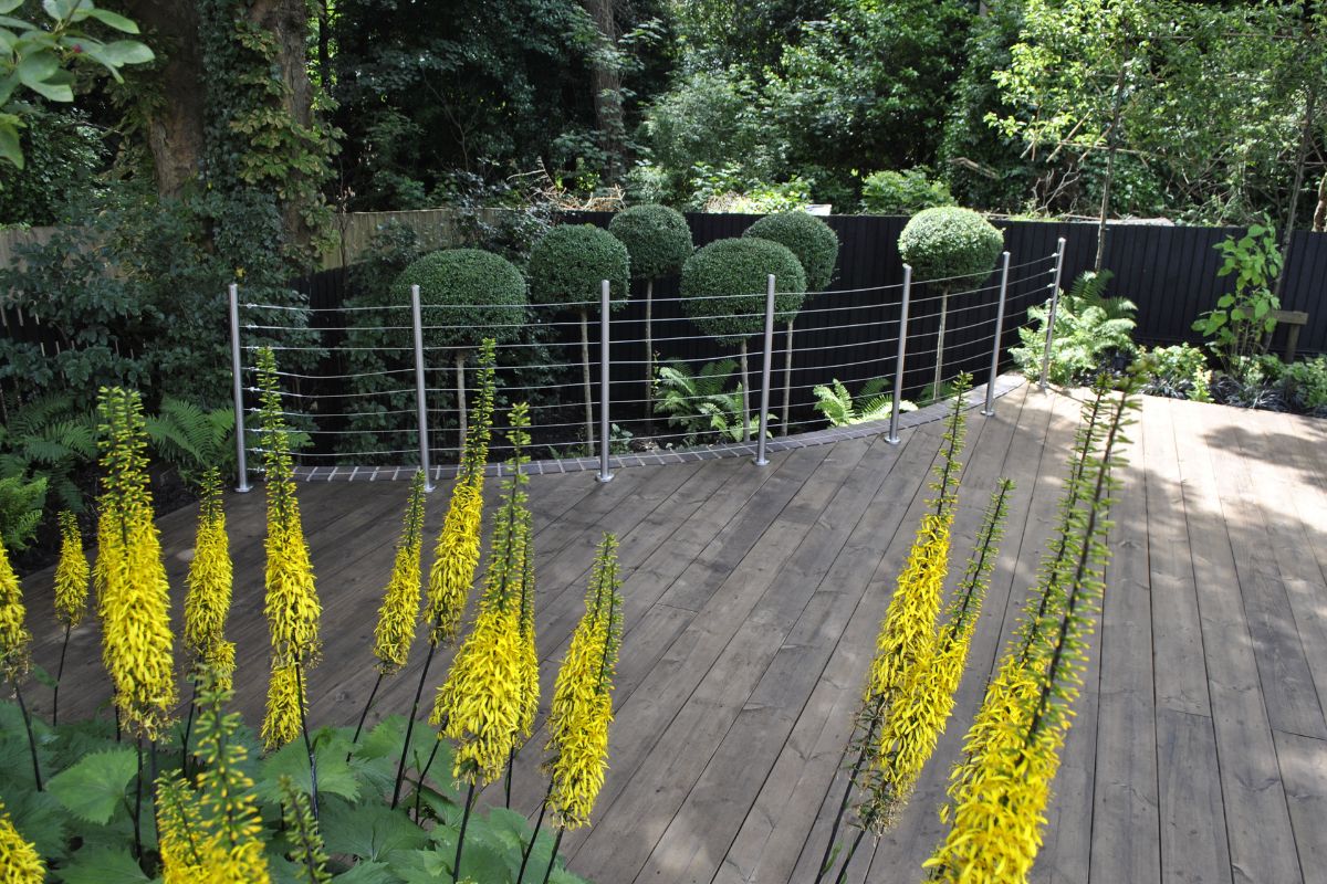 At the rear of the garden, near the mature trees, we installed a chunky redwood deck. This would be used as additional seating areas within the garden, allowing for more guests or to create a more casual ambience based on the occasion. The decking was enhanced with stainless handrails and cables, which not only look amazing but also create a secure environment for people of all ages to enjoy. During this installation process, we took extra special care to avoid intruding on the root systems of the trees nearby.