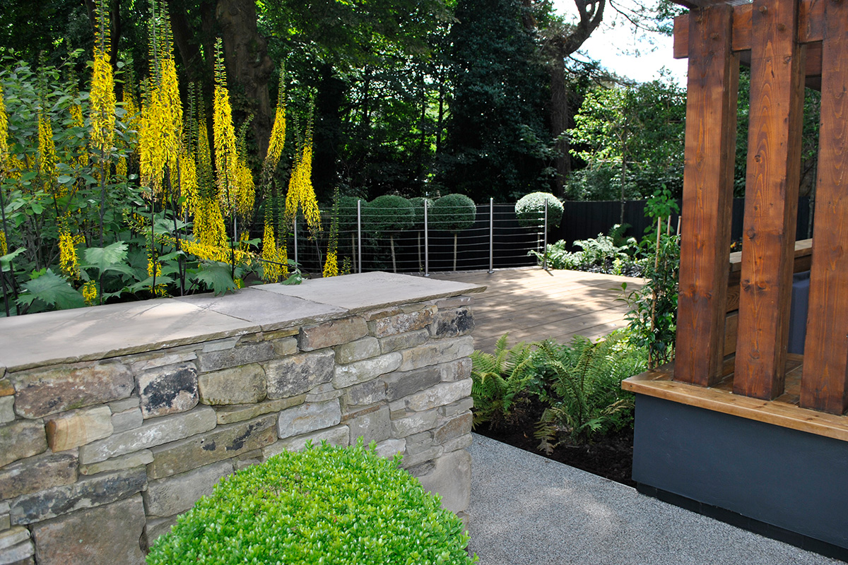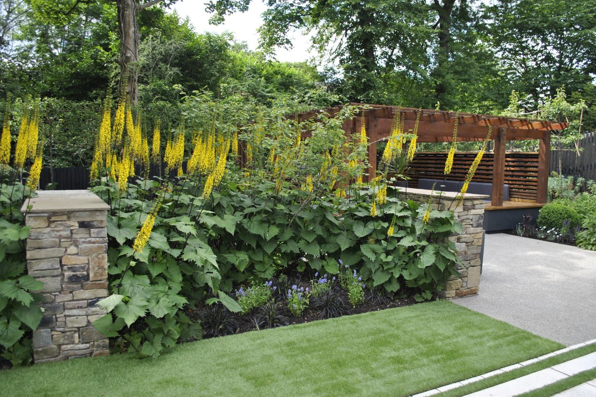 Ligularia sky rocket was used to add drama between the stone walls, as this plant can thrive in damp, shady conditions. The rest of the borders were laid out to shade-loving perennials and ground cover to ensure ongoing visual appeal, even in the low-light conditions.