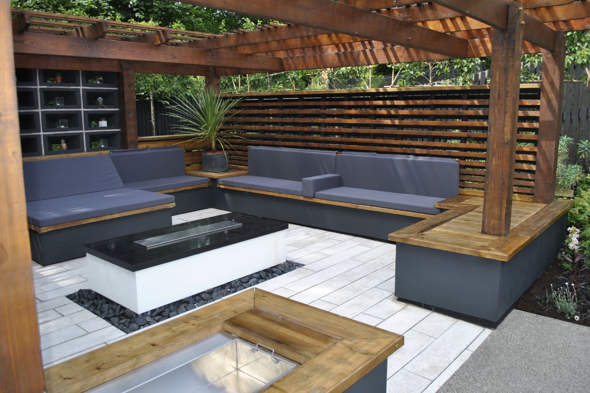 To accommodate our client’s desire for a party garden, we designed and constructed an open-top shelter. This would be the main party area within the garden, and was installed with a large gel-fuelled fire pit and polished marble top to fit their desire for a clean fire pit area. To make the space more inviting and comfortable, we added surround seating.
